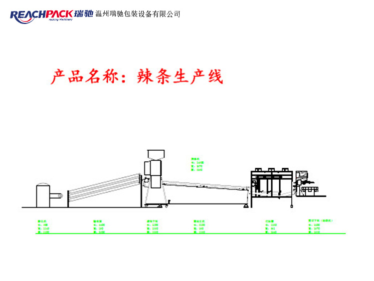 本全自動辣條生產線組成:包括面粉膨化冷卻機構、調味品加料機構、震動送料機構、過料緩沖機構、辣條送料切斷機構和辣條包裝機構(給袋包裝機)。整條包裝線長度約15米寬1.8米高3.4米
